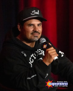 Supa-Star Michael Peña began his Brisnova panel by discussing his newest project, Subversion, which was being filmed in Queensland. “I’m on the Gold Coast filming a movie [at Village Roadshow Studios] with Chris Hemsworth, who was in a bunch of Marvel movies too. It’s a submarine movie and you’ll see it on Amazon next year, so that will be cool.” He teased us with his unofficial synopsis of Subversion: “We’re in the submarine and we save the day. He’s Chris Hemsworth, he saves the day a lot,” he laughed.